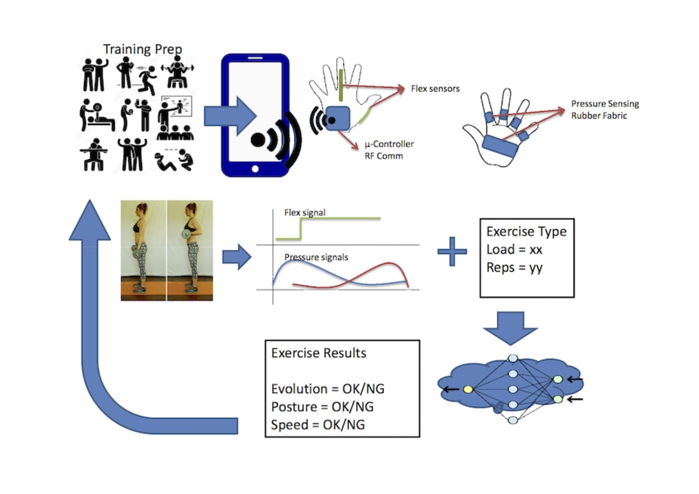 This proposal present a Smart Training Glove that uses sensors, such as, flex sensors and pressure sensitive rubber fabric to detect hand movements and exercise load to support physical training of recovering people or regular people that require some kind of training record. The record of the details of each training session can be used to feedback on the training profile and preparation and optimize results even when the trainer cannot always be present to accompany the trainee. The structure required to assemble this device are mainly off-the-shelf components, such as, micro-controllers, sensors and communication modules, but the interpretation of the resulting signals and the optimal array of sensors is still subject to study. In the future, my intention is to optimize the use of IoT, putting together other devices and communication to a cognitive cloud to make this system capable of online feedback to the user and/or trainer to check whether the exercise objective (including posture and desired pace) is being met or a correction is required.