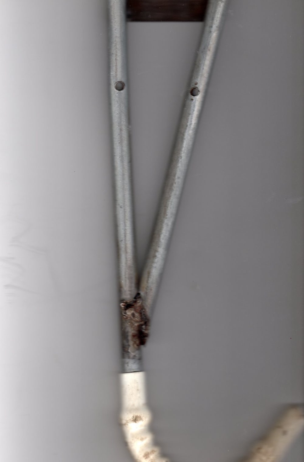 The proposition is that a bipedal walking stick offers greater stability for the user, and this has been demonstrated by an MS colleague using the prototype. Uses also include helping the user climb out of a motor car. The image provided simply shows the upper end of the walking stick, demonstrating the construction of the steel prototype.