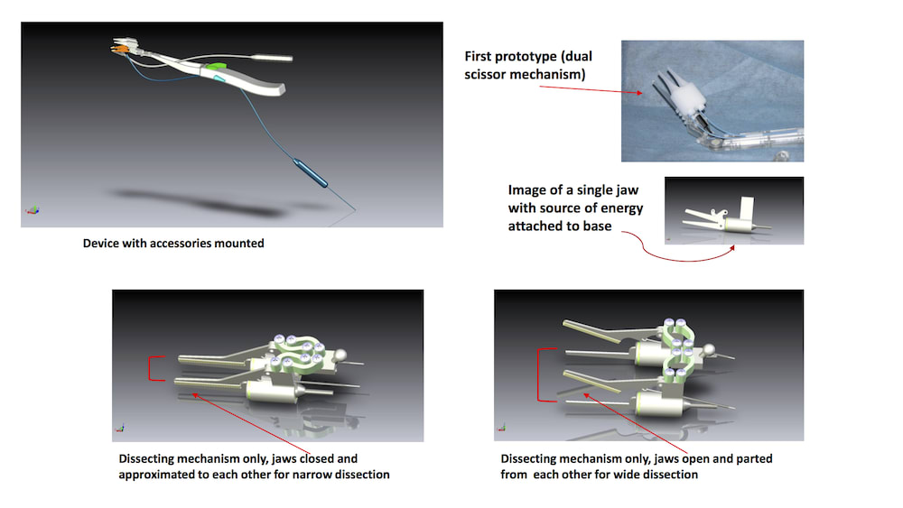 Our device enables the surgeon to harvest the vessel in a minimally invasive approach, through only a 2 inch opening on the side of the chest instead of conventional approach of cutting the chest bone, 3 times faster, and preventing potential collateral thermal damage. This device is comprised of 2 parallel scissor shaped jaws with a camera in between connected to an operating handle. These jaws use ultrasonic energy (harmonic scalpel) to cut the tissues around the vessel to harvest it. The ultrasonic energy, prevents high temperature generated by the regular cautery, a potential for collateral thermal injury. The dual cutting jaws adds speed and accuracy. The dual acting scissor mechanism has never been available before for any surgical application.