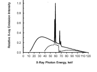 2) Figure showing the X-ray photon energy spectrum produced when 120kVp electrons strike a tungsten anode (solid curve), and calculated to be present after “filtering” by hafnium (dashed curve).