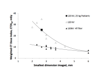 3) Figure showing the effect of using the hafnium filter. These data were taken observing a CIRS Model M007TE-04 tissue equivalent abdominal phantom, 10-year old size, custom modified to contain 1 to 6 mm dia. axial rods, with x-ray absorption properties 2% above the background matrix.