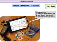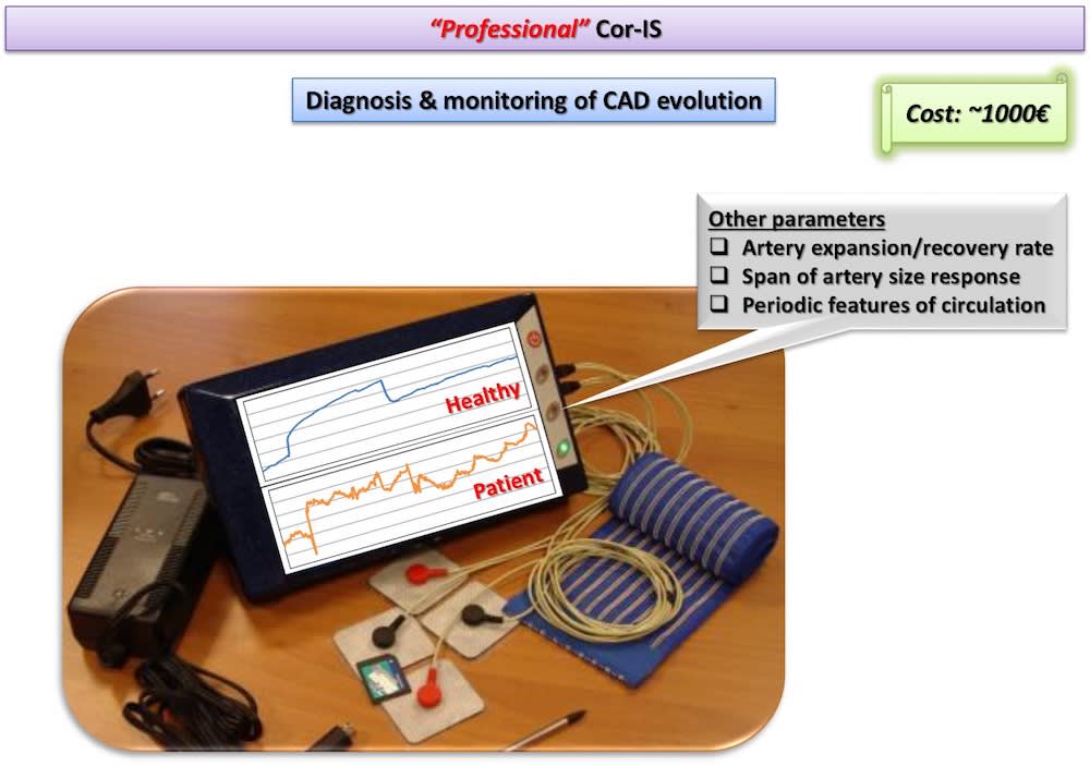 Two Cor-IS versions are currently under development: a) The “home” version for the early indication of an emerging CAD at home and b) The “professional” version for both diagnosis and monitoring of CAD evolution. It is worth-noticed that telemedicine applications can be integrated in the device for use in remote areas. Cardiovascular disease diagnostics market will reach 7 billion $ by 2018. Cor-IS device is very promising and its introduction to the market is considered feasible since ultrasound devices cost more that 30k€ while “home” Cor-IS will cost ~100€ and “professional” version ~1000€.
