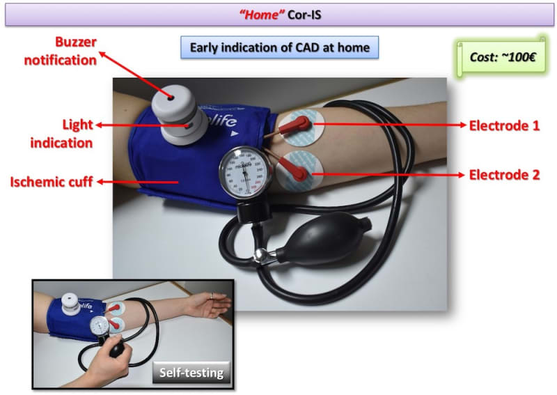 The device consists of the data acquisition/processing unit which is connected with a cuff and a pair of electrodes which are placed to pre-selected positions of the left hand. Cor-IS measures for varying excitation frequency values the electrical impedance response of brachial artery. The measurement lasts 15 minutes and is divided in three periods: 1st (5 min): Baseline impedance measurement, 2nd (5 min): Application of ischemic cuff that increases measured impedance, 3rd (5 min): Subsequent vasodilation and hyperemia through the Nitric Oxide release from the endothelium that decreases measured impedance. Cor-IS employs innovative methods for a) identification of proper excitation signal parameters, b) signal acquisition and c) digital signal processing that improve measurement sensitivity two orders of magnitude compared to conventional electrical techniques. Moreover, acquired signals are analyzed by means of custom-made, advanced algorithms in both time and frequency domain. Signal analysis focus mostly on the temporal variation of measured impedance, the transition phase from ischemic cuff to hyperemia and specific frequency components.