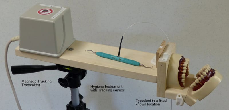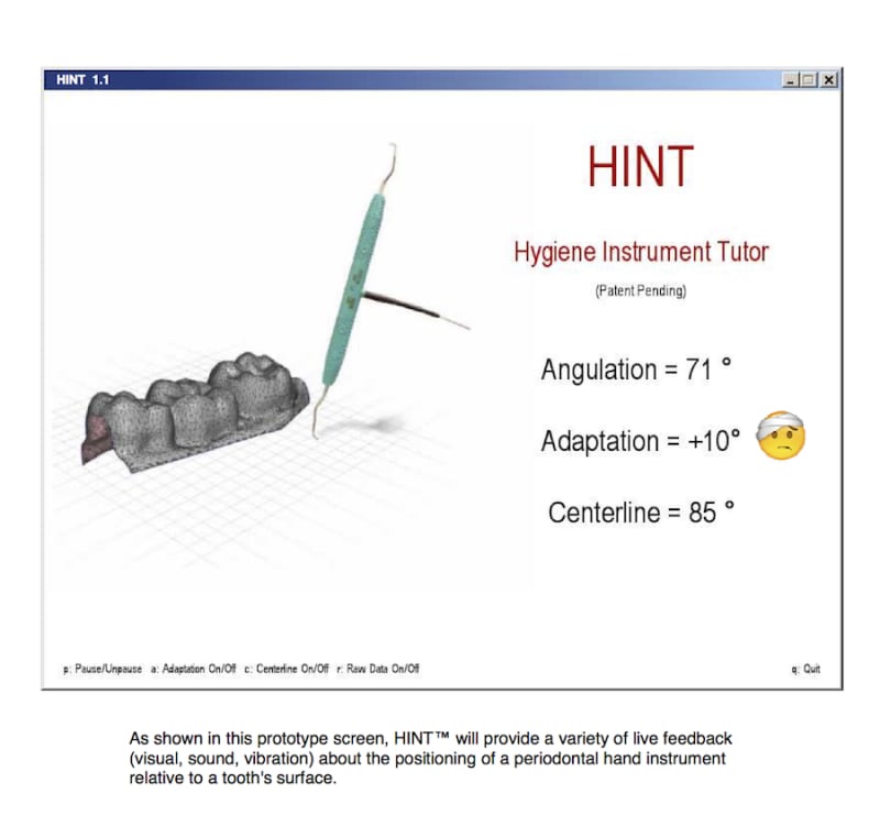 A revolutionary new product HINT™ is the first and only product to use modern Electromagnetic (or Optical) Tracking technology with 3D modeling and sophisticated software to measure and display the actual Angulation and Adaptation angles of a periodontal hand instrument. A sensor in the handle provides six Degrees Of Freedom giving the position and orientation of the instrument tip and cutting surface. Sub millimeter 3D models of the teeth, held in a fixed location, enables the software to measure and record the actual angles between the tooth surface and the tip’s cutting surface and track the entire stroke in real time. HINT™ software will have a wide variety of teaching modes and lesson plans, all designed to accelerate learning and free instructors to better manage the entire class while pinpointing specific needs of individuals. It can also provide a permanent record of each student’s achievements and allow remote monitoring or playback.
