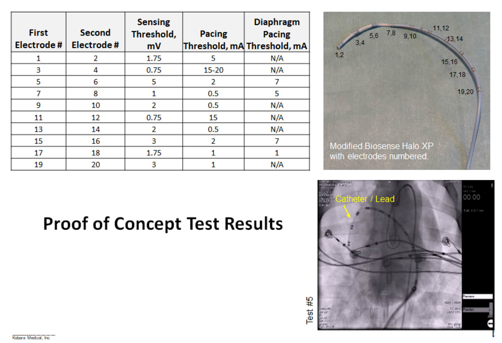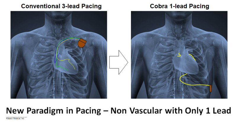 Product Overview: Kobara Medical, Inc is addressing the unmet need by developing an atraumatically anchored multi-chamber and multi-site epicardial lead that makes novel use of the heart’s transverse pericardial sinus (TPS). The first product is configured to plug into existing pacemakers, which provides a very attractive go-to-market strategy. The lead is epicardial so completely outside the heart. Non-coronary placement of the left ventricle (LV) electrodes improves LV pacing with no detrimental right ventricle pacing. Pacing Bachmann's bundle is possible from within the TPS and synchronizes the left and right atria. Finally, the solution is a single lead replacing 3 conventional leads and thereby costs less.