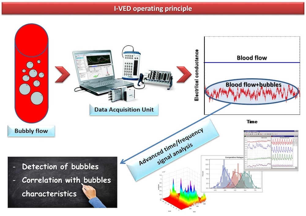I-VED was first calibrated and validated in-vitro in a benchtop flowloop that resembles DCS conditions in the human bloodstream. It was shown that the technique can reliably sense the presence of even a few bubbles with size down to 10 μm and, in addition, it allows estimation of their average size. This is based on the analysis of specific electrical signal features. Then, I-VED was tested in-vivo. Bubbles were either infused in the blood circulation of swines and of volunteer divers or generated by decompression in the body of volunteer divers. The latter was achieved by well-controlled dry dives in the Decompression Chamber of Hyperbaric Medicine Lab, in St. Paul General Hospital of Thessaloniki, Greece, and by well-defined wet dives in the NEMO 33 thermostated swimming pool in Brussels, Belgium. Electrical measurements were validated against ultrasound ones. Results demonstrated that I-VED can confidently detect the presence of both infused and generated bubbles. Signal analysis based on advanced algorithms (such as FFT/STFT, wavelets, spectrograms, HHT) enhanced considerably I-VED performance.