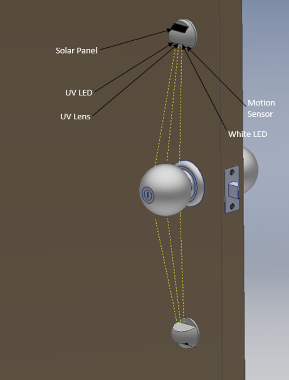 In this system two modules are to be placed on opposite sides of each door knob as well as a sensor mounted on either side of the door to detect the presence of a human for safety. The two modules will contain an ultraviolet (UV) LED which will produce UV light with the optimum wavelength for killing a large percentage of germs, bacteria, and viruses exposed to it. They will also contain a white LED so the door knob can be seen in the absence of any other light or in the event of a power outage. The system will be designed such that it can be retrofitted to any existing door minimizing the installation cost. It will also be fitted with a solar panel and a battery so the system is powered by any ambient lighting that is already present in the surrounding area. The installation of this system would greatly reduce the risk of disease transmission through contact with door knobs or potentially any other surface that has frequent human contact. There are manufacturers overseas that are willing to produce this system, but competition from other manufacturers within the United States would be welcomed. There is a patent pending on this system.