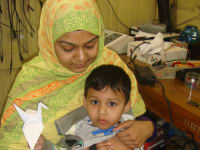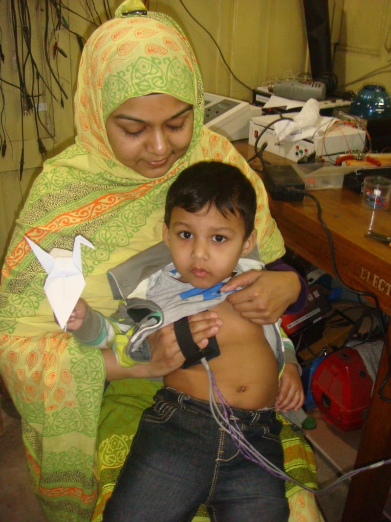 Pneumonia is still a major killer of children in rural areas of low resource countries which is difficult to diagnose in the absence of X-ray and other modern facilities. Besides, most of these places do not have qualified doctors, therefore either automated devices or telemedicine may provide possible solutions. Respiration rate provides a major diagnostic information in Pneumonia but children start crying whenever some instruments are attached to the body for acquiring data for telemedicine, and crying changes respiration rate. We simply made a palm worn electrode pad using which a mother touches the baby or the child (Figure 3) and the respiration changes are monitored without the baby crying. It has been tested successfully on several babies and children.