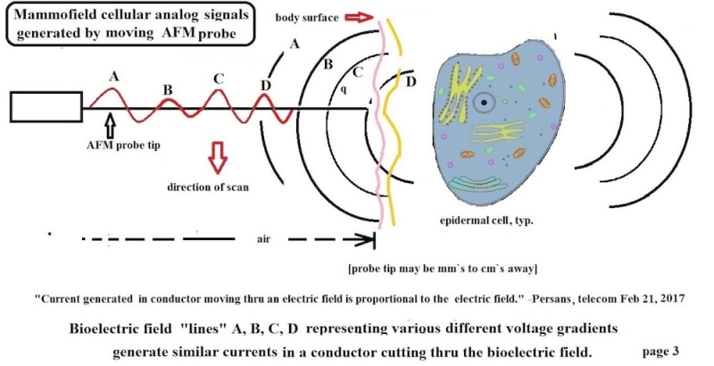 The present product, “Mammofield” scans a person`s an area to be studied. Preliminary results using non-contact passive AFM probes with tip radii of 1-3 microns show detailed data stream which can be searched for cell field potentials and currents. Earlier research with 0.001 inch probes also show some data stream for analyses.