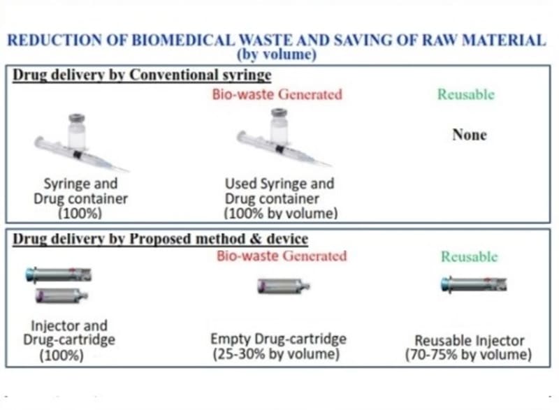 Our disruptive innovation provides a versatile, sustainable and inclusive solution to effectively curb syringe-related problems by eliminating syringes itself, by negating the carbon footprint of entire syringe industry. It will effectively reduce NSI almost to zero, which is a chief source and root-cause of all major dreadful diseases i,e. AID/HIV, Hepatitis B & C etc., to curb global disease & healthcare burden. It generates only 25-30% safe non-hazardous recyclable bio-medical waste without incurring any risk of NSI or reuse. Besides, it will also effectively address the menace of counterfeit injectable medicines, illicit drug abuse, contamination, and wastage of expensive drugs.