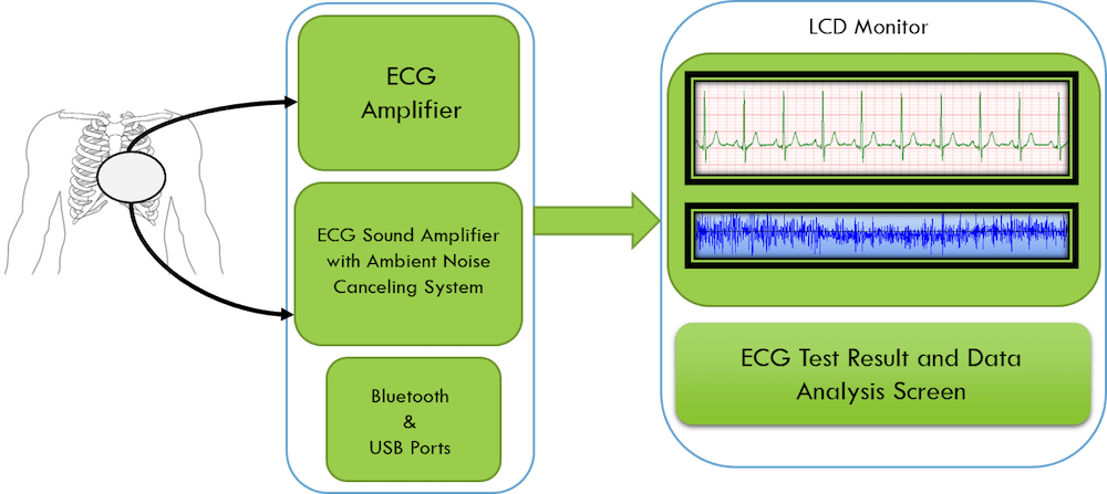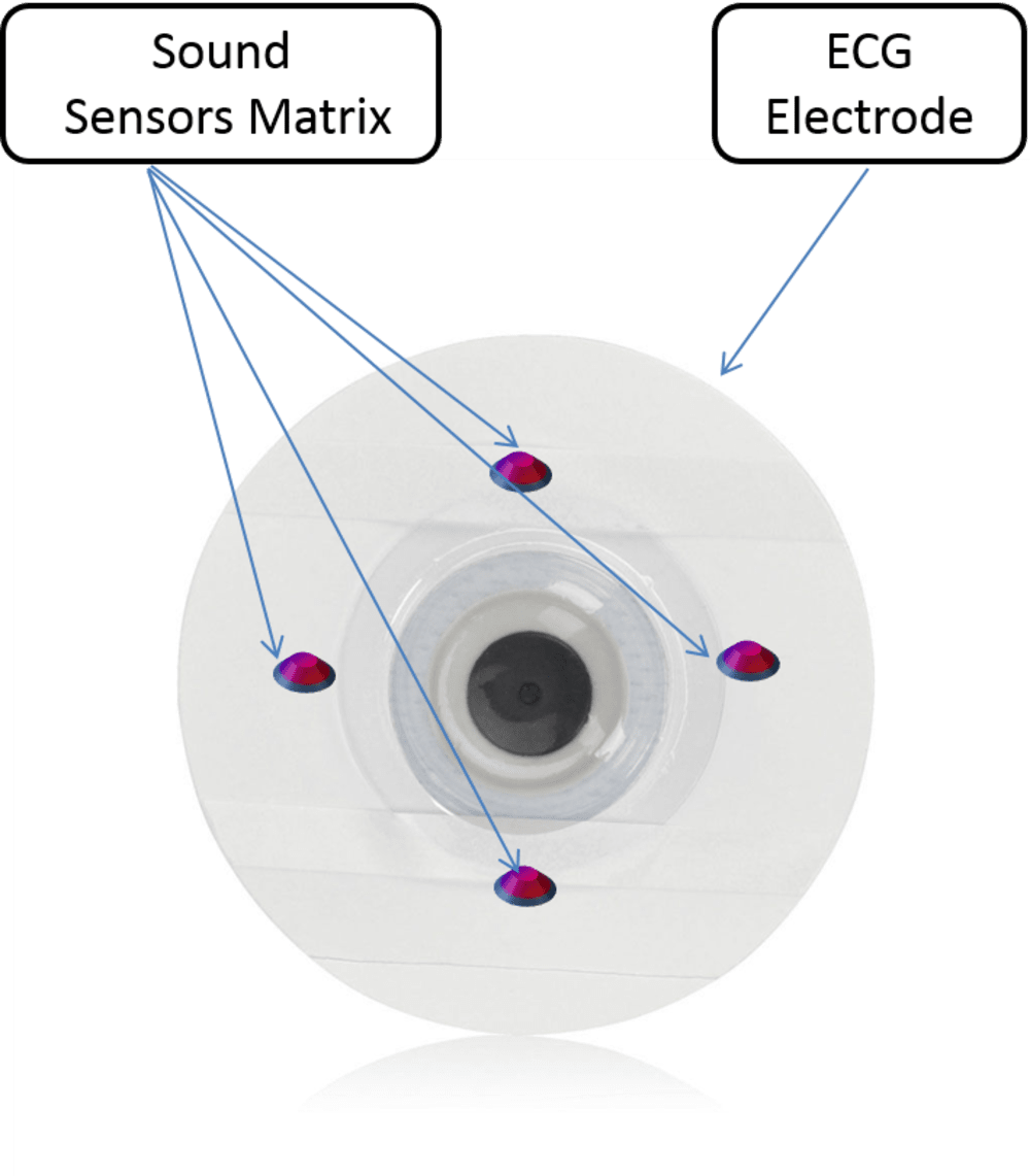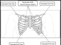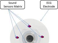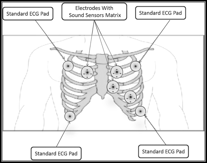 An electrode pad is modified with an array of CMOS MEMS (Micro-Electro-Mechanical System) monolithic digital sound sensors. The pad is embedded with four sensors covering 360 degrees of the patient’s skin contact area (Figure-1). This pad captures both electrical activity (ECG) and cardiac sound simultaneously. A specially designed cable carries these signals to the processor. Pad placement on the patient's chest vary with the type of monitoring desired (Figure-2). Examples for cardiac auscultation are Aortic, Pulmonic, Tricuspid and Mitral area. Examples for ECG are slow, fast or missed beats, and cardiac arrest. Both ECG and cardiac sounds are amplified and processed, filtered for ambient noise and artifacts and displayed on the monitor. It is possible to use mixed ECG pads such as those shown in Figure-2, the system automatically recognizes the Pad type and configure itself accordingly. The resultant data can be sent to a computer or smartphone via USB cable or Bluetooth for further analysis and emergency assistance in the case of cardiac arrest. Figure-3 is the simplified block diagram for this design idea showing both ECG waveform and the Cardiac sound on the handheld LCD screen with the final data analysis result.