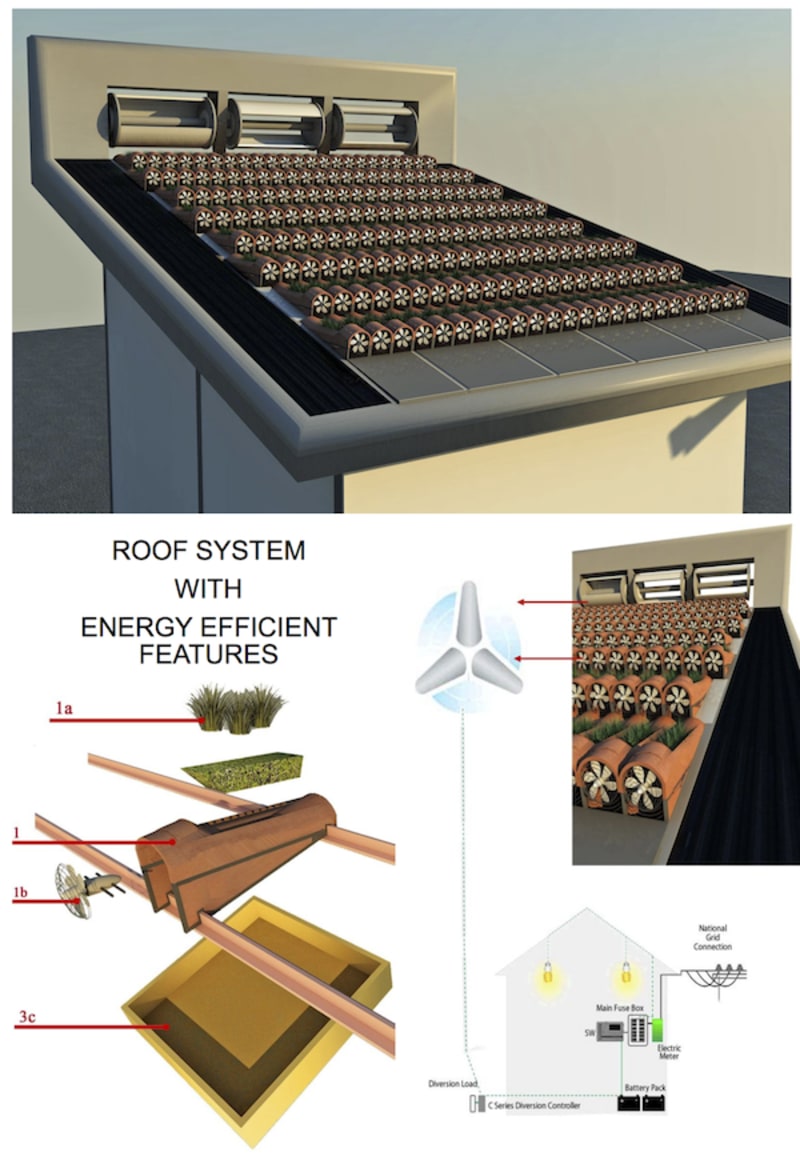 [0002] Some green roof systems can be used for filtering rain water. The rain water passes through the vegetation of the green roof system and enters a storage area. The water that has passed through the vegetation may not be potable, but may considered as “gray water” to be utilized for non-drinking activities such as for example, shower, toilets, and other cleaning type activities. However, such green roof systems may require a large area for installation and therefore may be difficult to install on buildings that have a limited space. Furthermore, such green roof system may not be configured to take advantage of various natural resources to generate electricity, provide drinking water, and/or provide clean air for the building.