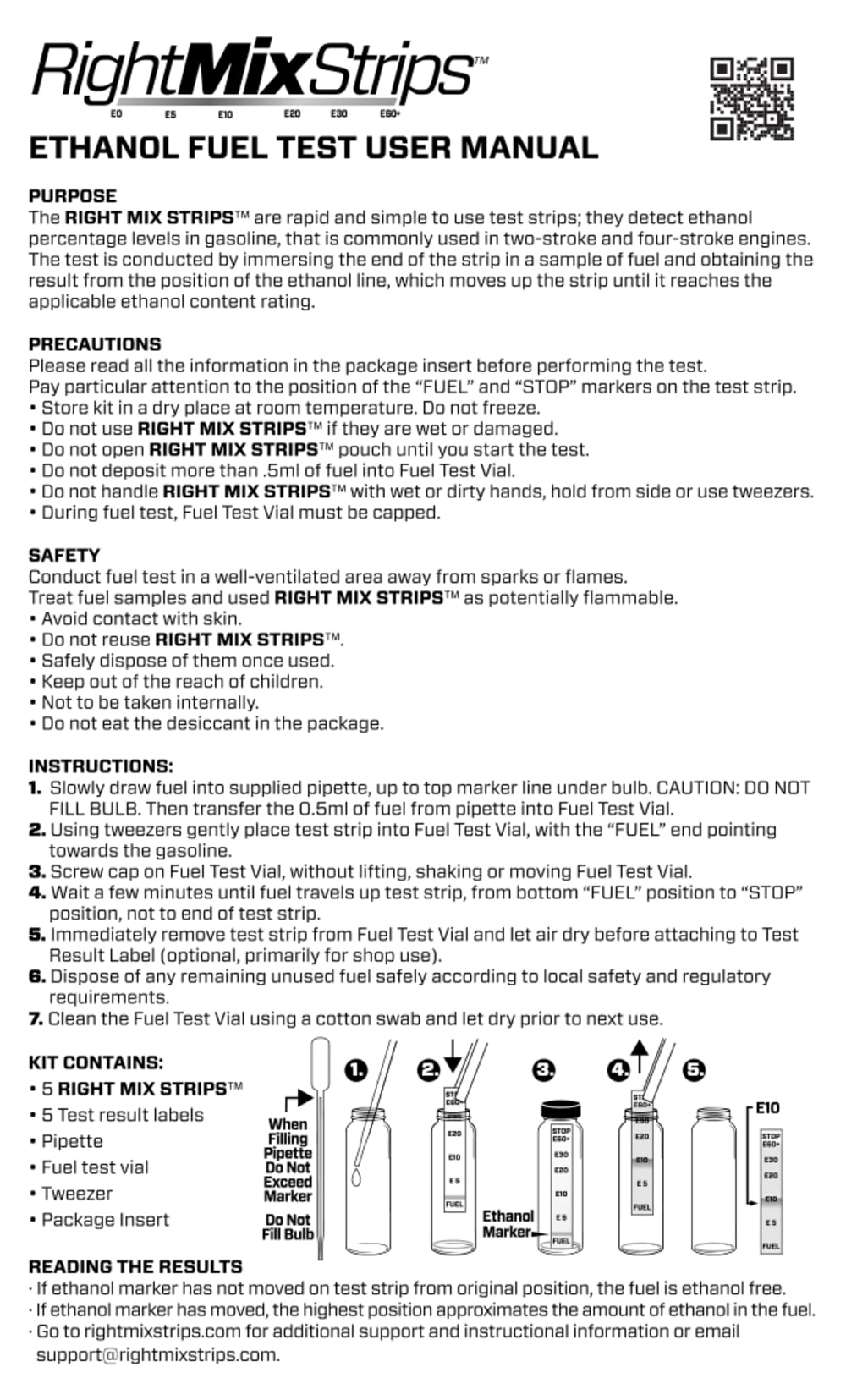 The RIGHT MIX STRIPS™ are rapid and simple to use test strips; they detect ethanol percentage levels in gasoline, that is commonly used in two-stroke and four-stroke engines. The test is conducted by immersing the end of the strip in a sample of fuel and obtaining the result from the position of the ethanol line, which moves up the strip until it reaches the applicable ethanol content rating.