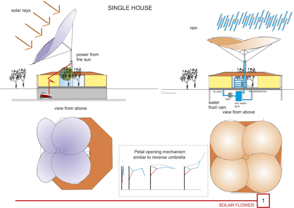 The surface facing the sun is covered by a thin transparent PV film, that can also be colored as need that will always be faced towards the sun to maximize the receiving area. Is can be opened and close with a mechanism similar to the reverse umbrella opening, rotated in various degrees to follow the sun direction or parallel to the ground to be utilized, in rainy days, to receive the rainwater and distribute it to underground water tanks for further utilization.