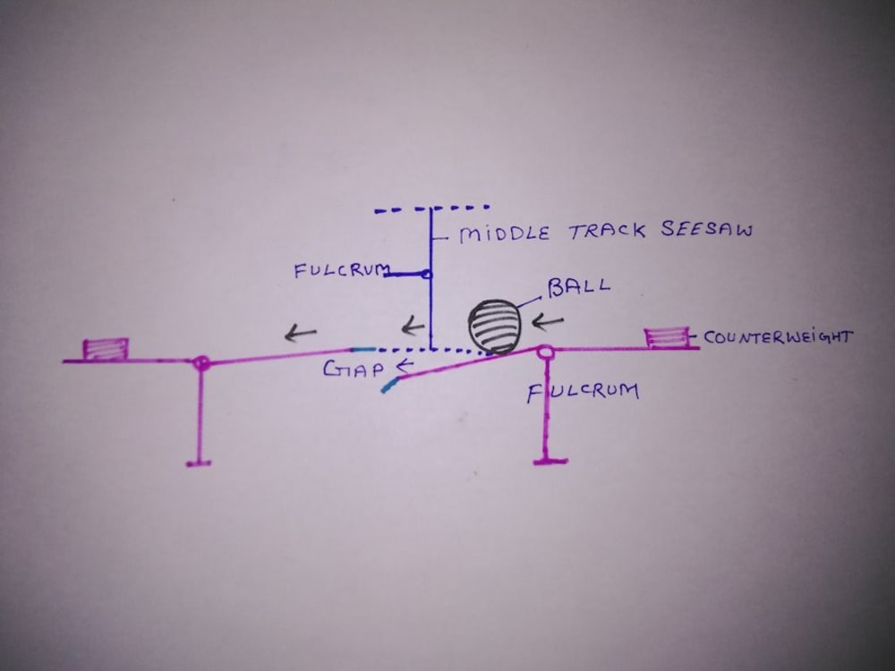 As per sketch there will be two seesaw systems and both will be attached with a stand.This stand will work to hold the seesaw. There will a middle track (MIDDLE TRACK SEESAW) which will work a pathway to transport the object from one seesaw to another seesaw.