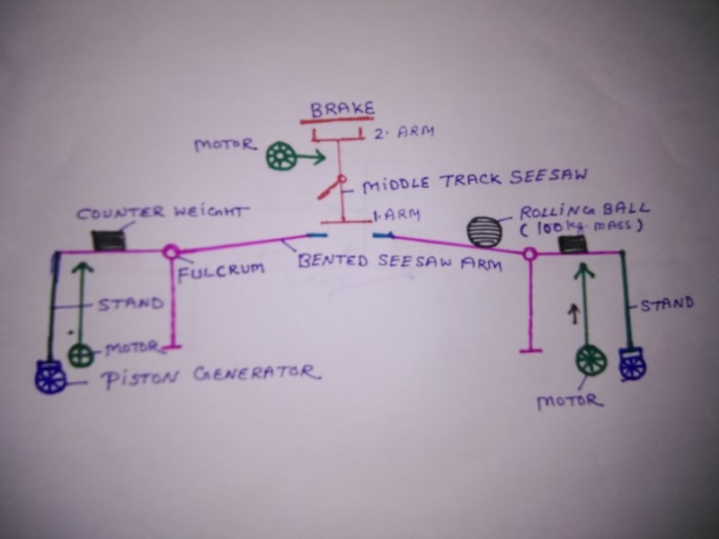 (7) This design will work as a free energy device. The counter weight arm of both side seesaws will work to generate electricity when this counter weight arm will hit the piston generator then the generator will work to produce energy.