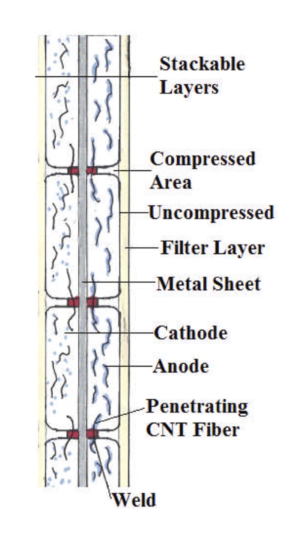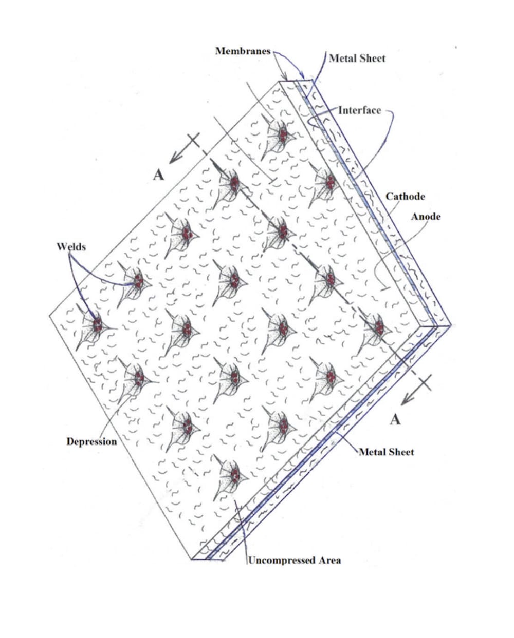 Proof of concept for these electrodes is trivially obvious when assembled as an electrochemical capacitor. Testing of e.g. LIB requires relevant chemistry. Either can be tested with applied pressure using the illustrated separator. High volume manufacturing can be accomplished with appropriate tooling to produce welded contact points, also illustrated.