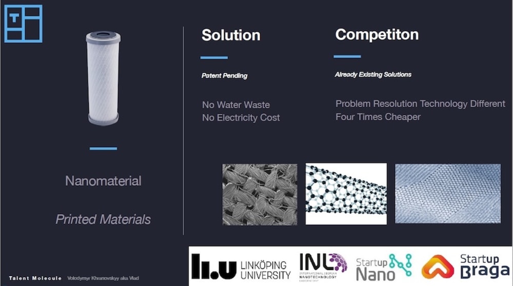 The idea originated and nanomaterials was developed by researchers at Linkoping University (Sweden) in 2016. Early in 2017 the project called GO CLEAN was awarded a 3rd prize and StartUp Nano Competition – H2020 supported project, leaded by International Iberian Nanotechnology Laboratory (INL). We grew our team by business experts and graduated the Acceleration Program at StartUp Braga. We incorporated the company “TalentMolecule LDA, incubated it at INL and are entering the market now. We are in the process of patent filing and plan to finalize it in August 2017.