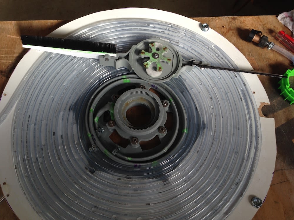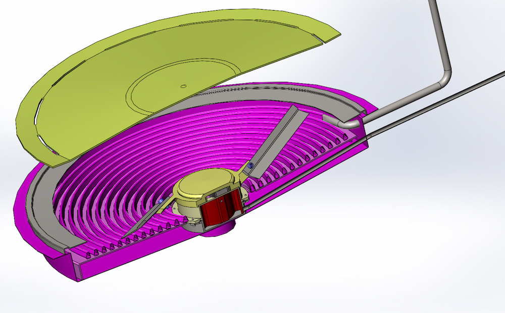If the heat exchanger needs cleaning, the cover can be removed to expose the heat transfer surface. Additionally the rotary sweep can be removed without tools. It sits on top of the turbine and is magnetically coupled. There is no drive shaft or shaft seals.