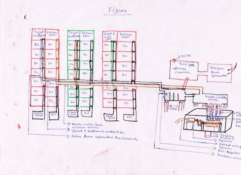 Again the excreta from the houses of these upper stories are collected to a bio-digester tank, which will placed at the second floor level, and which generates bio-gas. The water formed due to such transformation of excreta by bacteria-enacullam are added to the water tank of hydro electric generating system. The produced bio-gas is then passed through a bio-gas storage chamber which also collects from excreta from lower stories i.e. second story and below. Thus the project EHWE can supply energy which may be supplemented to the daily need of energy in a complex. The daily average energy may be utilized for lighting of boundaries, car parking areas or staircases of building complex. Energy generated depends on nos. of flats and building complex and amount of waste water and excreta. It may be 0.1Kmw to 0.5mw per day.