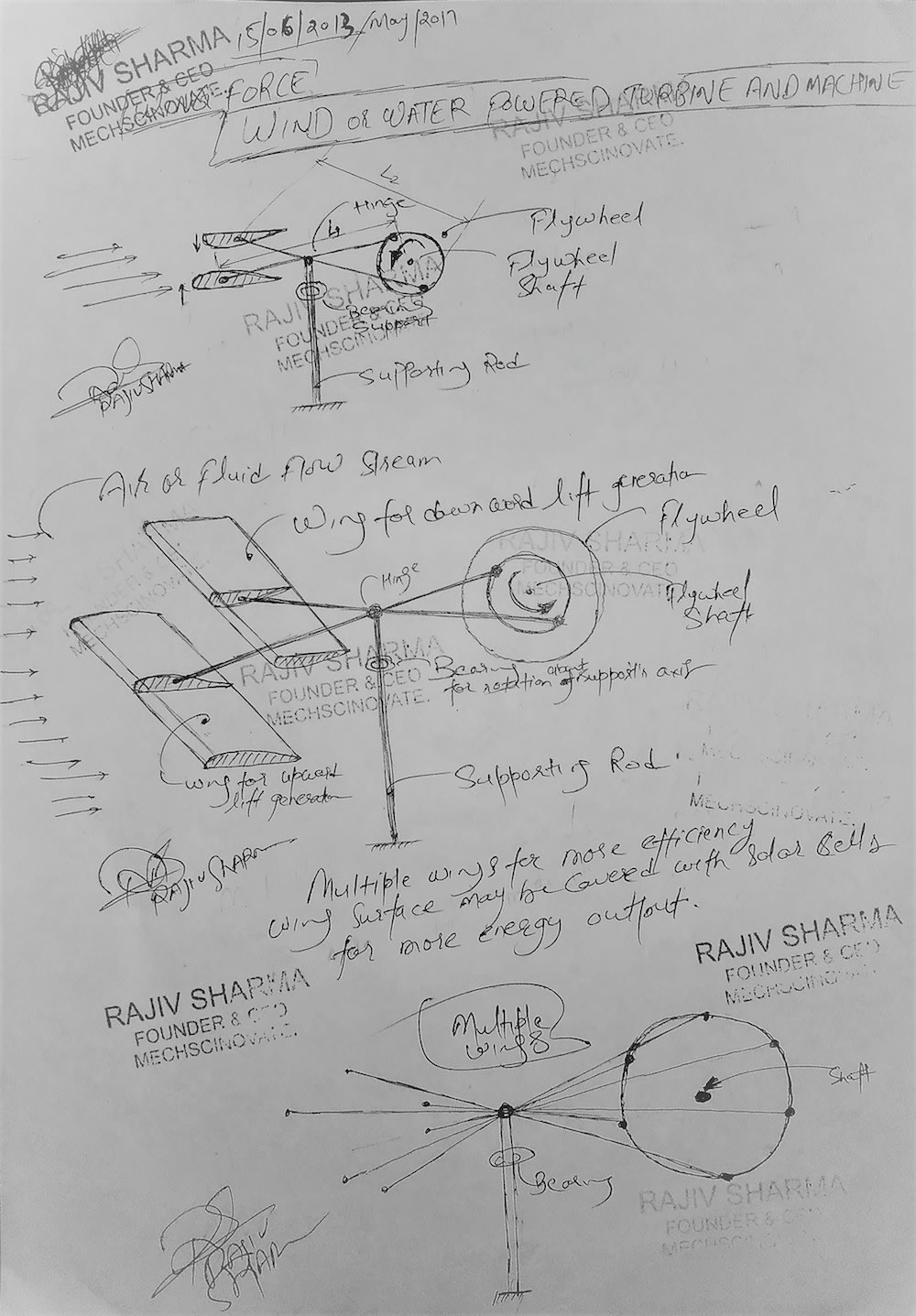 Working: Two different types of wings (according to airfoil shape) that are mounted opposite to each other generates the upward and downward lift force respectively as the flow of air or fluid passes over them. The net effect of generated lift forces will tend to rotate the flywheel in CCW direction. As the flywheel rotates it removes the fluctuation in output energy cycle. The output mechanical energy from flywheel shaft can be used to rotate the electric generators or machines.