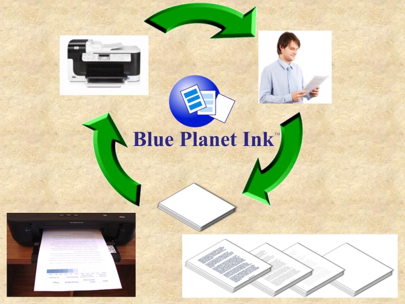 The problem with using paper only once is that it wastes natural resources and pollutes the environment. Using 16 sheets of paper has the same global warming effect as driving one mile. With today’s printers, people have to either work on a screen or accept the environmental consequences of printing. Blue Planet Ink lets them still print, but at a much lower environmental cost. Every time a sheet of paper is reused, the environmental impact from the paper is zero.