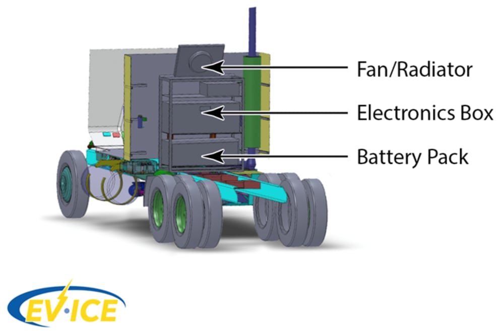EV-ICE includes several components including an electric motor, battery pack and computerized control system. Driven by the electric motor with the existing PTO port, it exploits the vehicles OEM drivetrain to propel it in EV mode. The system will accommodate the engines accessory and driver comfort systems while the vehicle is operating EV. At vehicle speeds above 24 MPH, the system seamlessly re-starts the diesel engine. The electric motor is utilized to re-charge EV-ICE via regenerative breaking…85% recharged in 15 minutes. There is also a plug-in.