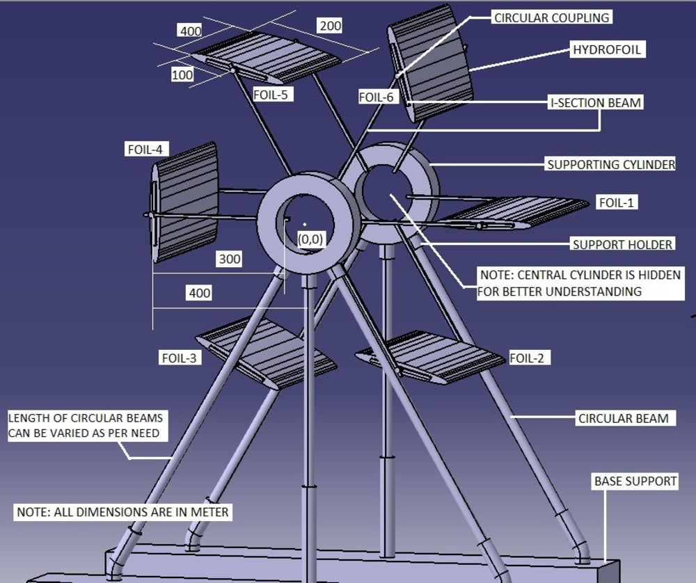 - Total 6 hydrofoils are incorporated at 60° from each other affixed to frame’s cylindrical structure by I-Beams.