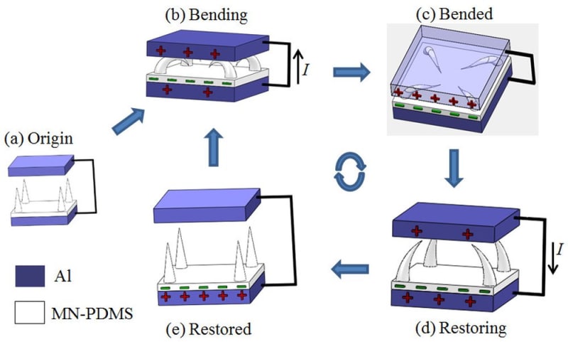 In this work, a facile method and novel mechanism using microneedle (MN) structured polydimethysiloxane (PDMS) are applied for TEG/TENG applications. The MN-TEG is the TEG device consisting of an aluminum foil and a microneedle-structured polydimethylsiloxane (MN-PDMS) film. The MN-PDMS was fabricated by a simple, low-cost, rapid-fabrication method using CO2 laser ablation on a polymethyl methacrylate master mold and molding process. The MN-TEG can convert wasted mechanical energy into electricity. The special characteristic of MN-PDMS is great increase of randomly closed bending-friction-deformation behavior of MNs that highly enhances triboelectric performance of the MN-TEG. By hand tapping, the new high-aspect-ratio MN-TEG can generate high output performance with the open-circuit voltage up to 102.8 V and the short-circuit current of 43.1 A, corresponding to the current density of 1.5 A cm-2. The MN-TEG’s durable mechanical working was confirmed over 500 min, that is, more than twenty-time tapping of 1500 sec stable electric power generation. The output energy of the MN-TEG can be stored in capacitors with fast charging and high charging voltage, for example, on a 0.1 F capacitor up to 2.1 V in about 0.56 sec simply by hand tapping. The MN-TEG source under tapping can directly light up 53 LEDs with different colors connected in series.