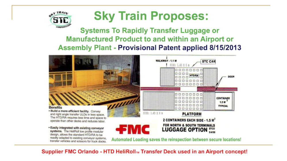 Evaluated as suitable by the Ports Council, Awarded the Sustainable FLORIDA 2015 as a Green Building Finalist! We at Sky Train Corporation (STC) offer a system which combines green transit with alternative energy. A wider vehicle that can supply more than subway capacity, with shorter boarding platforms, at double limiting speed, and comfort, and that offers an automated secure luggage handling option.