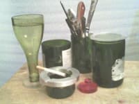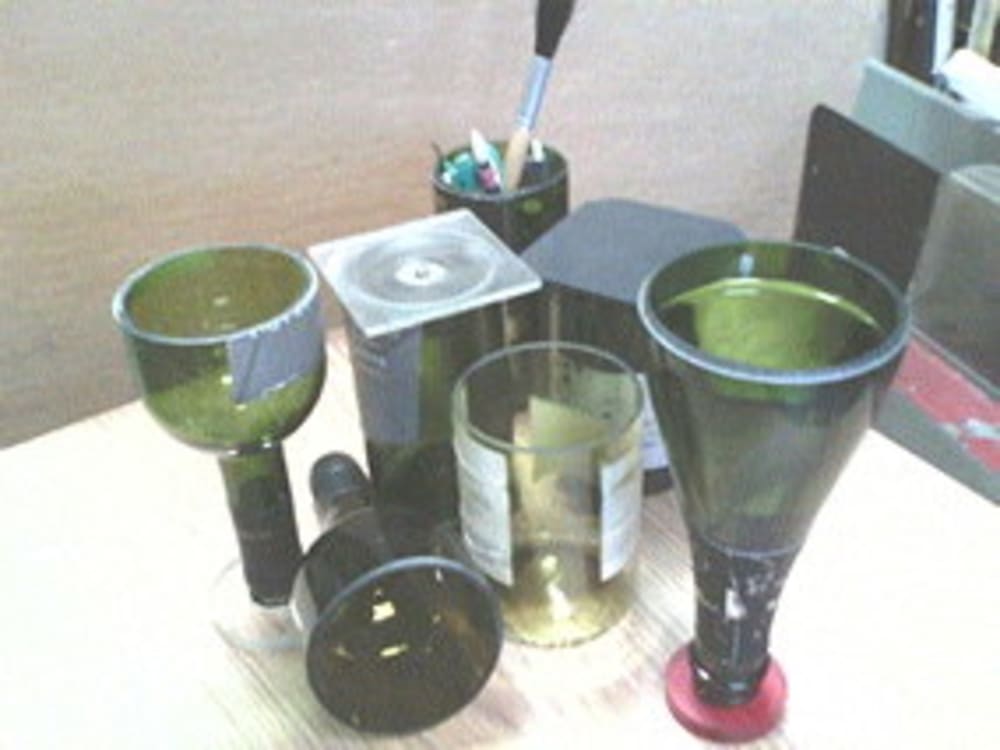 If there is a novel feature of the invention it is in the accessories to be used with the cut bottle. A turned or molded plastic part, preferably acrylic, with an oversize base and an o-ring turns the funnel portion of the bottle into a wine glass or a flower vase. Without this piece it is useless as a glass. The base piece may instead use a recycled cork that is fitted into a tapered hole in the plastic piece. The cork may be covered with a silicone or latex "condom".