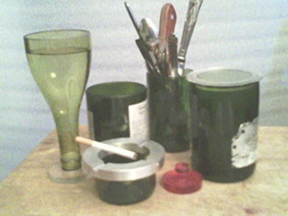 The current invention concerns recycling. The concept is simple. Take an item out of the garbage and turn it into something useful- something people will eat from. This is accomplished by cutting a glass bottle in two. By cutting a bottle in two you create a drinking glass (or a caddy) and a funnel. There is nothing novel about cutting a bottle in two. It is more problematic as glass is a brittle material that is difficult to work with. The material can be cut by diamond grinding, - using a form cut off wheel on a lathe ( employing the concept of diminishing progressive cutting utilized in my previous patent #5,516,242). Additionally,the glass may be faced with the formed wheel, and it can be used to leave a chamfer on the part. Other possibilities for cutting the glass may be laser cutting or water jetting.