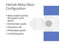 A baseline Nexus module serves as a core habitat. Nexus can support 2 to 3 persons. It includes food, sleep and hygiene facilities. It includes rack space for control, atmosphere and water recycling facilities, food growth and experiments. There is additional space for work and storage. The Nexus can be equipped with photovoltaic cells, propulsion module and cupola. Several modules can be combined for a space research or operations center. In fact, a space hotel can be built, where additional Nexus units are used for private, self-supporting hotel rooms. Beyond Earth orbit, the Nexus and add-on modules can be used for an expandable Lunar or Martian settlement.