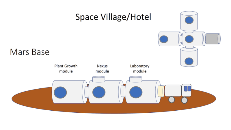 At a hardware level, the ExoHab ecosystem would be built around 6.1 meter long, pressurized shells that are based upon the ISS multi-purpose logistics module (MPLM). The MPLM is space-tested hardware that is already compatible with existing space systems. The MPLM is relatively small, so that it can be launched on several rockets including the SpaceX Falcon 9 (or Heavy Thrust version for a highly loaded module).