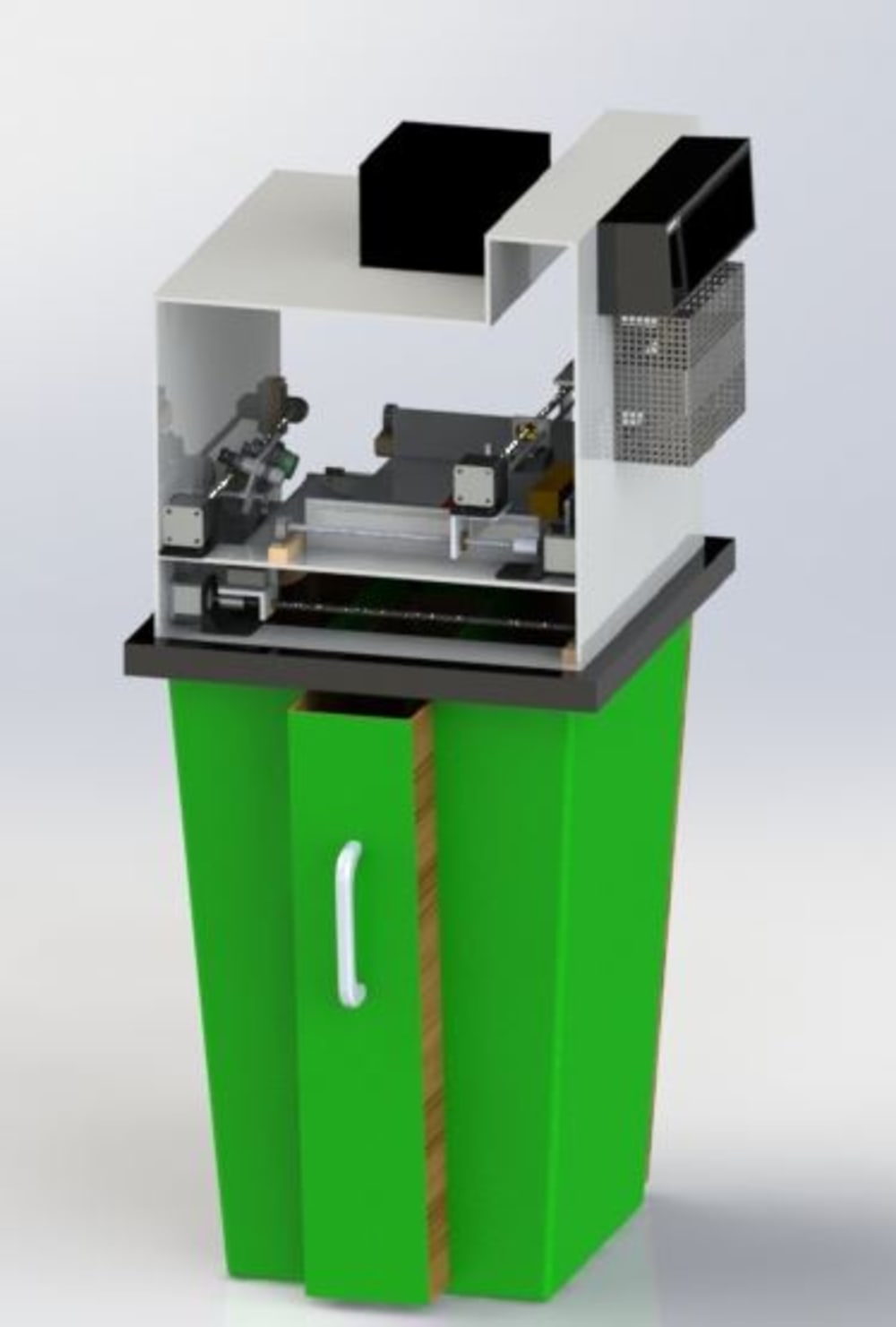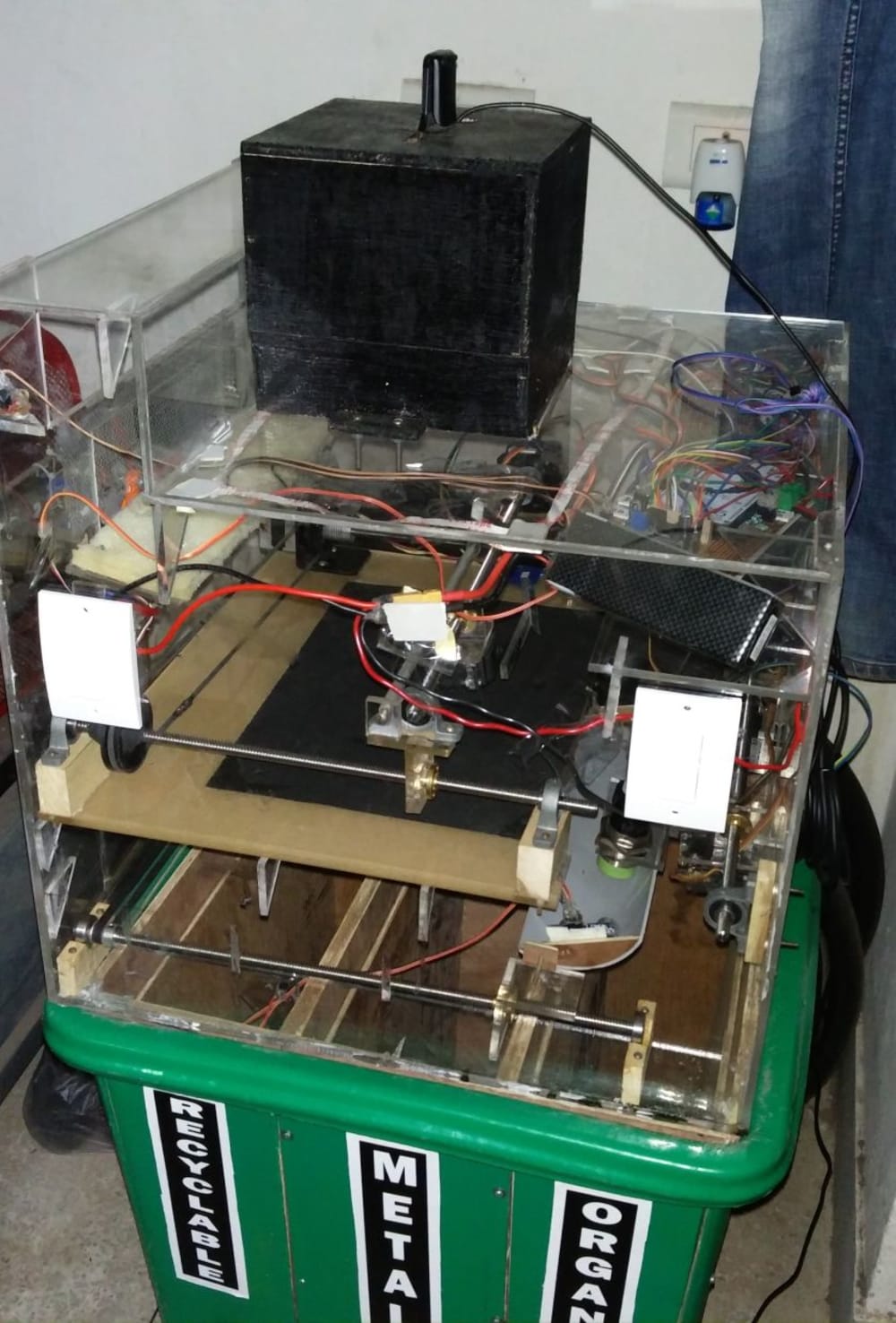 The dustbin is divided into 3 compartments- Recyclables, Metal and Biodegradable waste. The waste collector is common in both classication and disposal mechanism. Here, the waste collector works as a carrier of specied garbage to its respective bin. The waste collector is mounted on a lead screw with the help of a servo motor. Once the waste is identied, the waste collector moves the waste to its appropriate bin with the help of the lead screw.