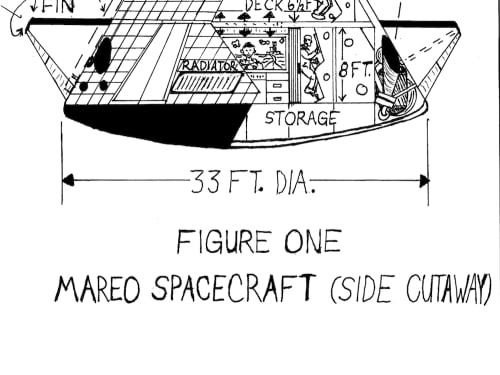 Orbiter: MAREO is twice the diameter of the NASA Orion spacecraft. External Bays of the cone house Main Engines, angled nozzles pointed forward and outward; as well as reserves of fuel, oxidant, water,