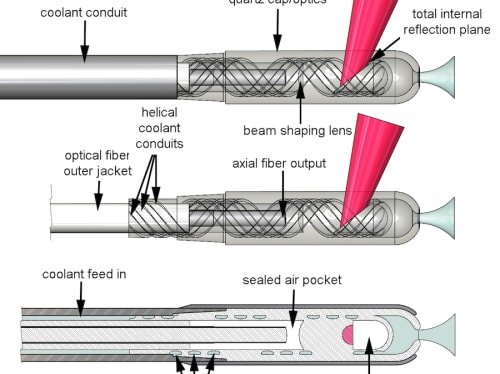 Infrared surgical lasers, e.g. CTH:YAG @ 2100 nm and TM:YAG @ 2000 nm, are wonderful tools for minimally invasive surgery such as laser vaporization of hyperplastic prostate tissue (BPH), but they are completely incompatible with right angle, off-axis delivery fiber optics find great utility for vaporization of prostate gland lobes about the urethra at less challenging wavelengths, e.g.