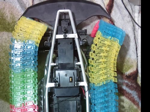 Multidirectional flexable track can allow a motorized tank, tractor, or other track laying vehicle to have its front guide-sproketed-pulley-wheels to be physically turned on a verticale axis thereby turning the vehicle. Multidirectional flexable segmented tracks are often used as electrical wire cable guides in industrial factory automation and linear translation stages in laser micropositining equipment,. Recently,