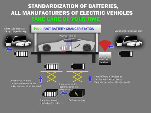 Electric car needs to be charged from an external source of electricity, this takes time. In my project, the concept of developing stations for quick replacement of batteries for any type of electric vehicle (Quick battery change stations instead of gas stations).