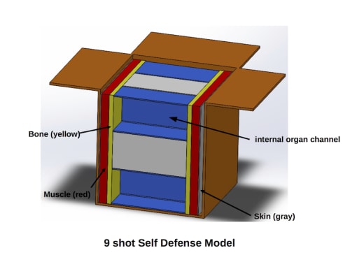 The Torso in a Box replicates the anatomical variation in material properties of the intended target. Panels of material simulating skin, muscle, bone and the internal organs are layered in the appropriate order to create a model for testing the effectiveness of self defense ammunition on the intended target.