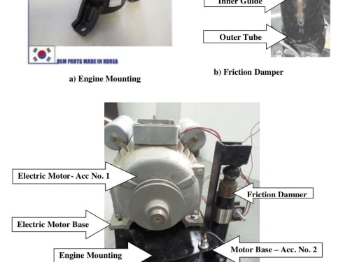The original mount of the test-vehicle engine is Passive Hydraulic Mount, see Figure 1.(a). The friction damper was added to the original mount in parallell. The modified mount system is a different size than the original one with an additional weight of 200 g. Figure 1(b) shows the friction damper unit of the mount.
