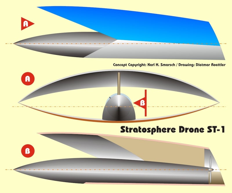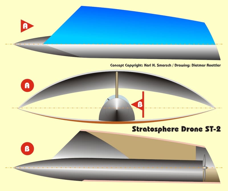 An idea from 1985 now updated. Although direction back to balloons, drones are more flexible. Large wing area with solar cells, bent slightly to catch more light when the sun, off apex. 2 concepts ST-1, and ST-2. Concept can be enlarged for passengers. Concepts also useful for Mars missions, rather than helicopter. Drones to carry 100kg to 200kg equipent for surveillance, or Internet,TV transmissions to remote areas.