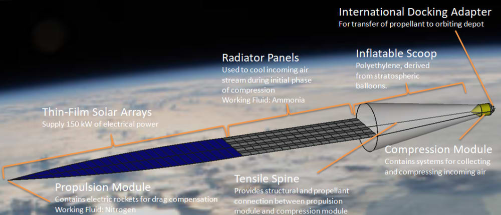 The collector spacecraft are designated “Pelican,” for their habit of descending into Earth’s atmosphere to collect sustenance. Each has a mass of 2,600 kilograms. This includes an inflatable ram scoop, electric thrusters to compensate for atmospheric drag and to change the spacecraft’s orbit, thin-film solar arrays to provide power, equipment to compress and liquefy incoming gas, and the spacecraft’s structural, thermal, communications, and control systems. The spacecraft are designed to be launched in groups of 8 inside the 5-meter fairing of a standard expendable launch vehicle.