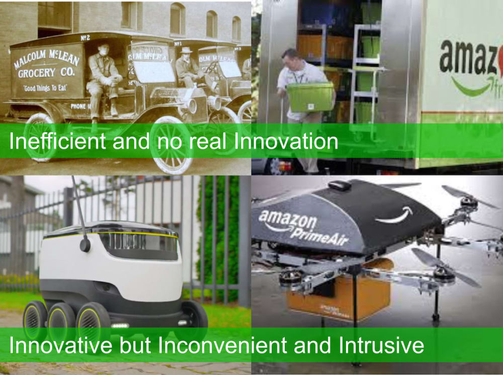 Shopping for groceries is time consuming and inefficient. It simply does not make much sense to use a 2,000 kg car with a 100 kg person to collect (or deliver) 2 kg of groceries.