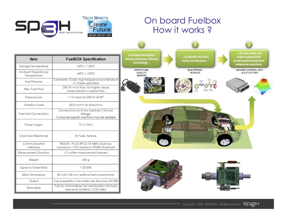 The arrival of stricter regulations and the impact of the various scandals that continue to shake the automotive world make the introduction and then the spread of a set of connected sensors as necessary "real time" monitoring elements for the regulation on the CLEAN internal combustion engine. As it is already the case for the performance of pollution control systems in cars, these technologies will show the smooth functioning of regulatory systems. Then automakers would like to offer cost-effective CO2 reduction solutions to their professional customers who pay an annual vehicle tax and/or for CSR (Corporate Social Responsibility) awareness. The first vehicles “drop-in-fuel” ready and equipped with new connected solutions will be dedicated to the market of captive fleets (private companies, town, communities, and states) and commercial vehicles for TCO and Tax reasons. And it becomes clear that keeping a record of the CO2 reduction from the tank to the wheel can be achieved with the Fuelbox, the SP3H fuel quality sensor.