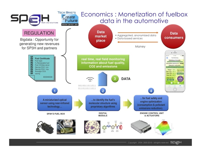The Fuelbox developed by SP3H can accurately identify the molecular content of fuels and digitize it. The "digital-connected" layer will simply be added to the existing technology and systems around the holistic system “fuel-engine” to automatically display information/necessary steps to the regulatory/legislative body through the vehicle's existing connection. This will be done through open innovation business model and industrial partnership with Tier 1 suppliers. The generation and valuation of the CO2 reduction in bigdata, notably for regulatory reasons, affect both captive fleets and commercial vehicles. However, the offer could also rapidly expand into all vehicles, in response to increasing demand from drivers, to offer more and more information to customers willing to pay for access to the connected data, as shown by various recent studies. Smart sensors like fuelBOX provide new set of data/information around Fuel/CO2 can generate up to US$ 4 billion in annual revenue (including aftermarket sales) between the sensor, system and bigdata equipment partners, only on the fuel sensor part and probably double if the recurring revenues related to the digital platform part and data processing in the Cloud are included.