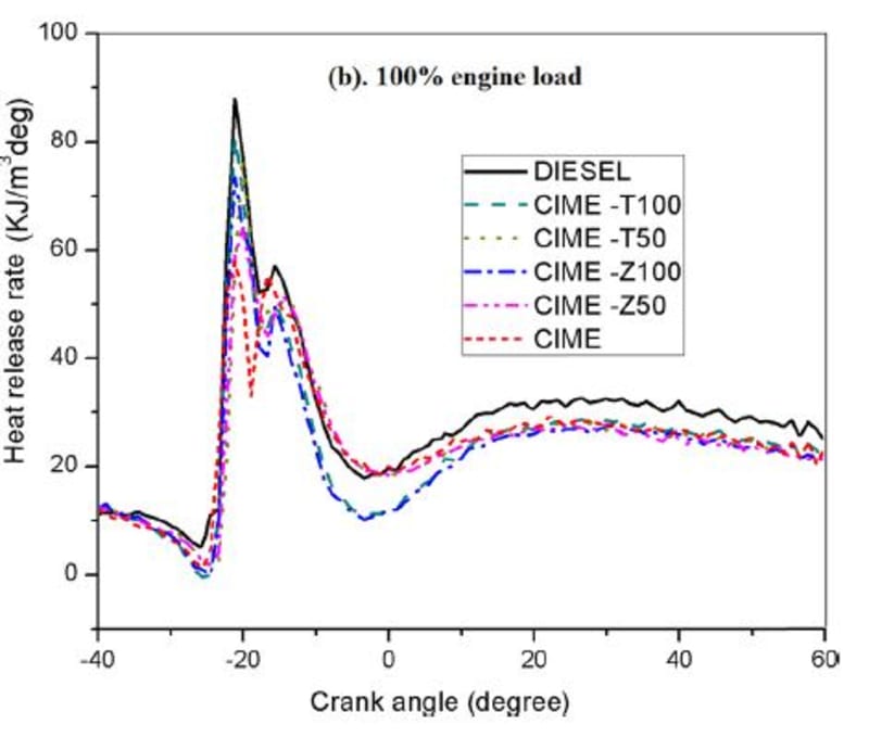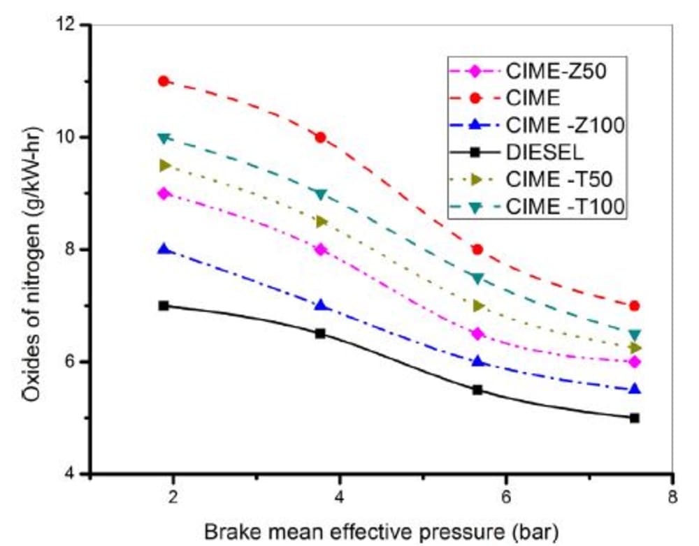The diesel engine operation with CIME nano emulsions improves brake thermal efficiency by 5–17% compared to pure CIME fuel at maximum brake power due to large surface to volume ratio of nanoparticles which exhibit rapid evaporation and better atomization. Further, the CO and HC emissions were reduced drastically for CIME nano emulsions compared to pure biodiesel and conventional diesel fuel. The NOx emission was lower than pure Calophyllum inophyllum biodiesel for all CIME nano emulsions but slightly higher than conventional diesel fuel. The smoke emission of diesel engine was reduced drastically for all CIME nano emulsions compared to both pure biodiesel and diesel fuels at all engine loads. Combustion characteristics of in cylinder gas pressure and heat release rate were increased by the addition of nano particles with pure Calophyllum inophyllum at all engine loads. Finally, it can be observed that the doping of nano particles with biodiesel has a very good effect on performance characteristics with notable improvement in performances and minimum emissions.