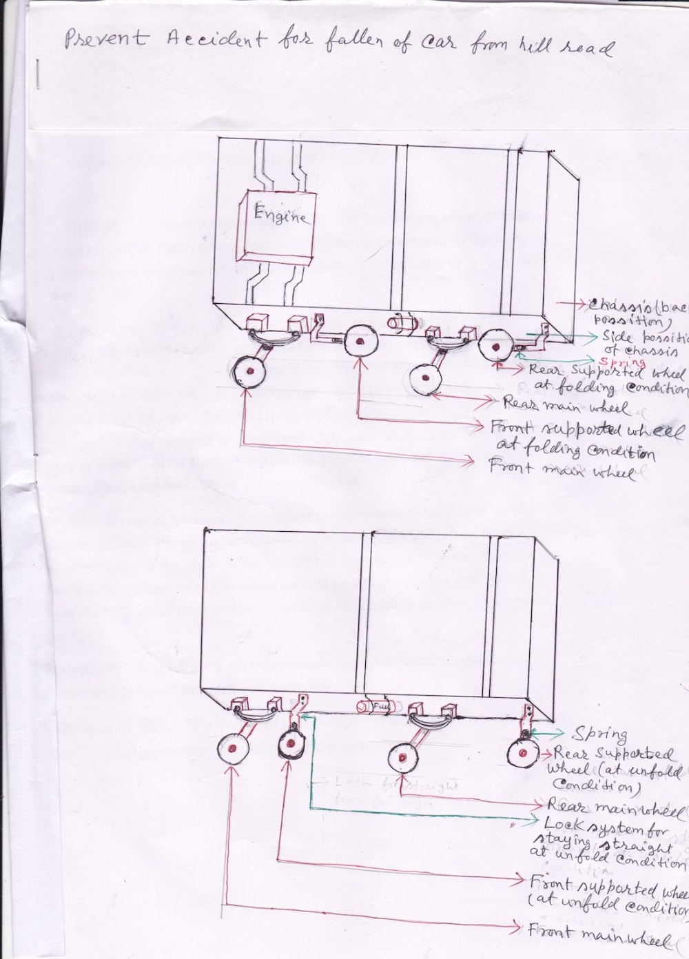 For my innovation, on a car that runs on hilly roads, to be fitted with four extra (supported) wheels with chassis, which are foldable when needed. Two wheels to be fitted at just rear position of front spring plate and these wheels can fold parallel with chassis towards back side. Another two wheel to be fitted at the end of chassis and these will fold towards front side of chassis. These supported tires may be smaller size than main tires, but all tires' bottom position will stay at the same level. A strong but easy 3 to 4 inches contractionable spring to be fitted with the catcher (stand) of supported tire.