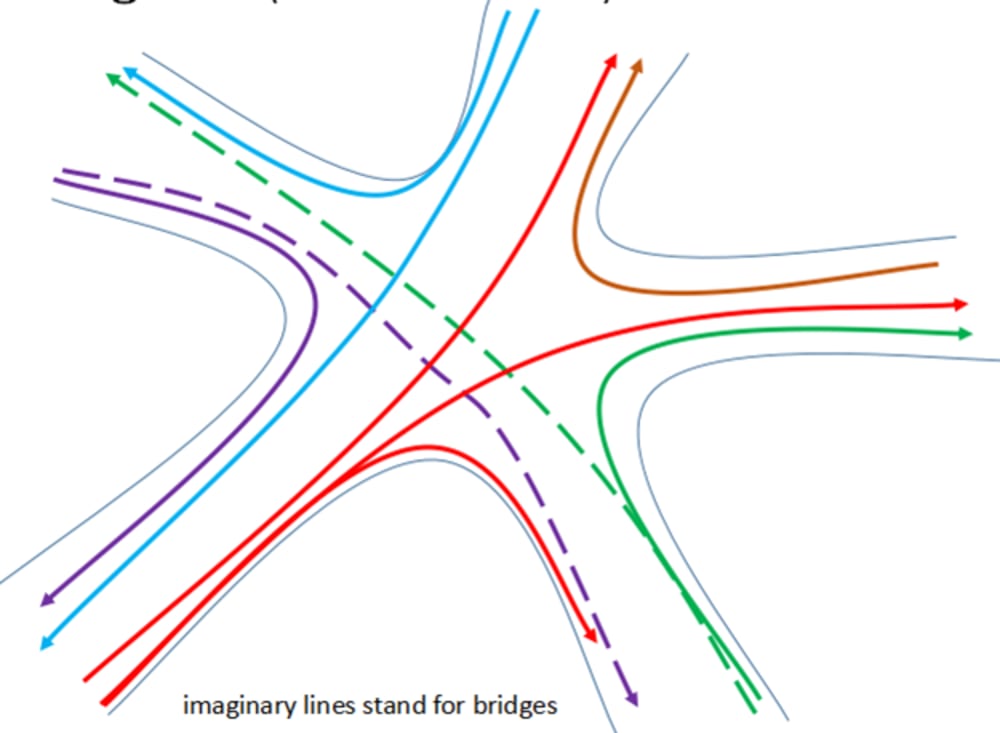 So here is our ultimate solution: we can use LTP to reduce conflict points from 16 to 4. Meanwhile, we can build bridge at intersection to eliminate the remaining 4 conflict points caused by vehicles going straight from upright directions. We proposed different solutions for various types of intersections, including the most typical cross intersection, T intersection and five-way intersection.