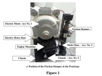 The original mount of the test-vehicle engine is Passive Hydraulic Mount, see Figure 1.(a). The friction damper was added to the original mount in parallell. The modified mount system is a different size than the original one with an additional weight of 200 g. Figure 1(b) shows the friction damper unit of the mount. The electromagnetic actuator creates the normal force for the friction contact, consists of a toroidal iron core, which is divided into two halves by two air gaps. The friction contact consists of two ordinary friction pads from industrial brakes which are pressed against a moving friction rod by the actuator. In the engine mount the friction rod is connected to the engine bracket and the ground plate with the actuator is connected to the chassis. The force of the actuator is given by the reluctance force between the two halves of the iron core. These halves are attached to a ground plate via a combination of leaf springs and elastomer elements, providing a very high stiffness in the direction of the friction force and at the same time a high compliance for the horizontal movement of the actuator which is necessary to bring the friction pads in. In especially designed experiments these effects are assessed. The prototype presented in Figure 1 (c) fully replaces the original. Experimental evaluation carried out on the test-rack confirmed the superior performance of the friction damping approach over the original mount. In Figure 2, the results of the measurements taken at rotational speeds of 1000 and 2000 rpm on the prototype are presented and showed that the percentage reduction in terms of RMS of time history vibration transmitted to the chassis is 61.10 (without friction damper) and 80.60 (with friction damper)at 1000 rpm, while at 2000 rpm is 53.70 (without friction damper) and 81.90 (with friction damper). Figure 3 depicts the position of the friction within the vehicle.